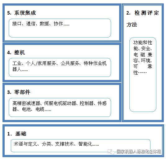 逐步开展:(1) 机器人关键零部件研制及应用示范工程,用标准服务与指导减速器、控制器、伺服电机及驱动器、传感器等关键零部件的研制及产业化应用;(2) 工业机器人核心技术研究及应用示范工程,将标准服务于指导工业机器人核心技术、多工业机器人协作技术及智能工业机器人技术研究,并按照细分行业推进示范应用;(3) 服务机器人技术研究及应用示范工程,将标准重点服务于应急、检测、能源、医疗、康复、养老、助残、救援等服务机器人的研制,创造良好社会和政策环境,推进国产产品的示范应用。在试点示范工程中了解标准化需求,通过标准对试点示范项目开展评价与验收。