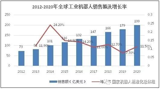 全球工业机器人销售额及增长率(2012-2020年)见图1。